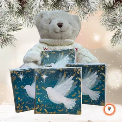 Send a message of peace, love and hope this Christmas with our elegant Dove of Peace and Love Christmas cards. Set against a serene teal background with gold branches, leaves and stars, the dove symbolises love, peace, harmony and compassion, making these Christmas cards a perfect choice for the season of goodwill.