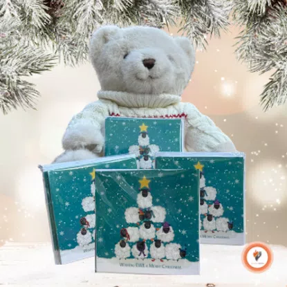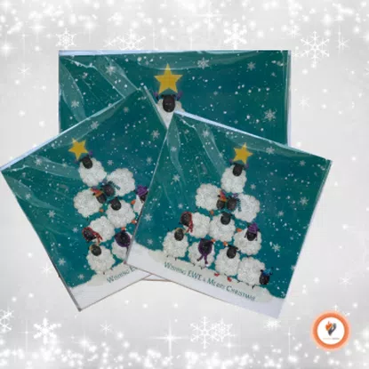 Featuring a charming illustration of festive sheep in the shape of a Christmas tree with a star on the top against a wintry backdrop. These lighthearted cards add a touch of humor while supporting a meaningful cause.
