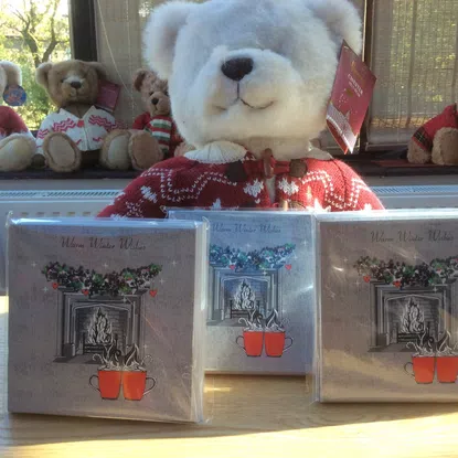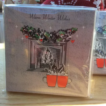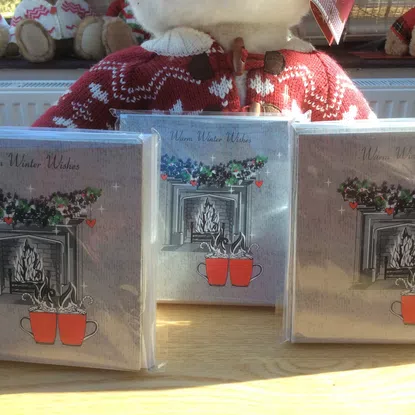 Spread Winter warmth with this elegant and cosy card design featuring a decorated fireplace and two mugs of steaming hot cocoa! 100% of the profits from all products in the online shop, including the Charity Christmas Card selection, go to Burning Nights CRPS Support charity.