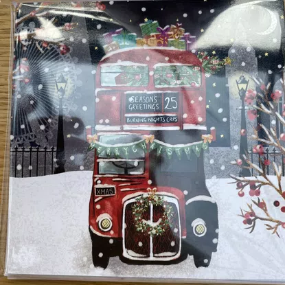Share your Winter well-wishes with this stylish card design featuring a classic red London bus delivering presents in the snow! 100% of the profits from all products in the online shop, including the Charity Christmas Card selection, go to Burning Nights CRPS Support charity.