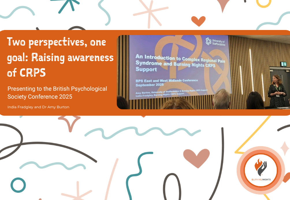 Complex Regional Pain Syndrome (CRPS) is often described as one of the most painful conditions known to medicine. Yet it remains poorly understood, even among healthcare professionals. By combining the lived experience of a Burning Nights CRPS Support volunteer (India Fradgley) with the insights of an academic researcher, therapist and volunteer (Dr Amy Burton), our presentation offered two perspectives on the same condition. Together, we highlighted not only the science behind CRPS, but also the human story that brings the research to life.